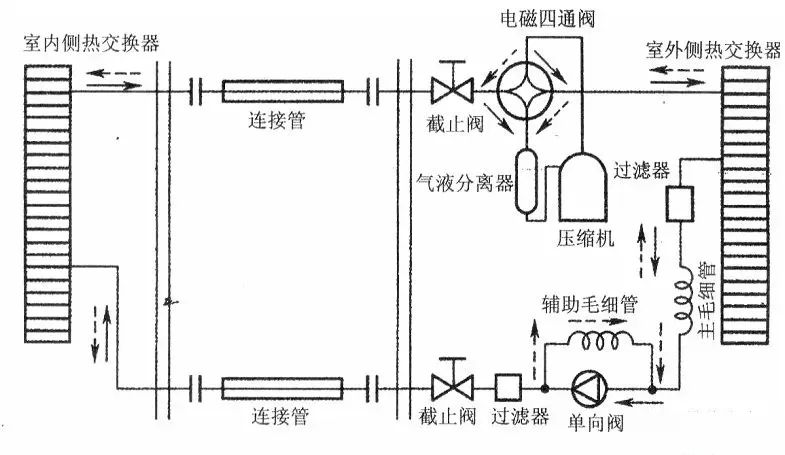 3、 熱泵系統(tǒng) 。與單冷系統(tǒng)情況相同,熱泵運(yùn)行是否正常,主要檢查四通換向閥的工作情況。換向閥換向時,可聽到有比較響的氣體流動聲以及電磁閥頂針的撞擊聲(電磁場吸動閥心),當(dāng)電磁閥在換向過程中聽不到上述兩種聲音,那電磁閥可能出故障。