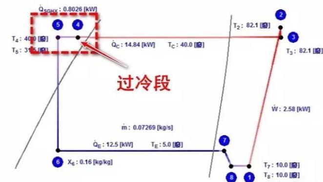 過冷是為了使節(jié)流前的制冷劑液體減少在節(jié)流過程中產(chǎn)生的閃發(fā)氣體,減少閃發(fā)氣體所占容積的比容,提高單位制冷量;同時(shí)也提高了回氣的過熱度,對(duì)保護(hù)壓縮機(jī)不處濕沖程運(yùn)轉(zhuǎn),都有一定的好處。過冷度在壓焓圖的表示: