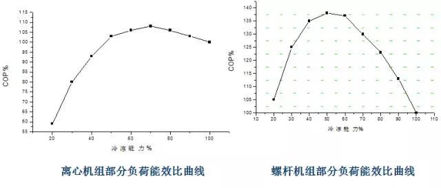 螺桿機組 :廠家的RSW-1000-4機組為例,機組滿負荷COP為5.24。機組在75%、50%、25%負荷下COP分別為6.63、7.23、6.03。
