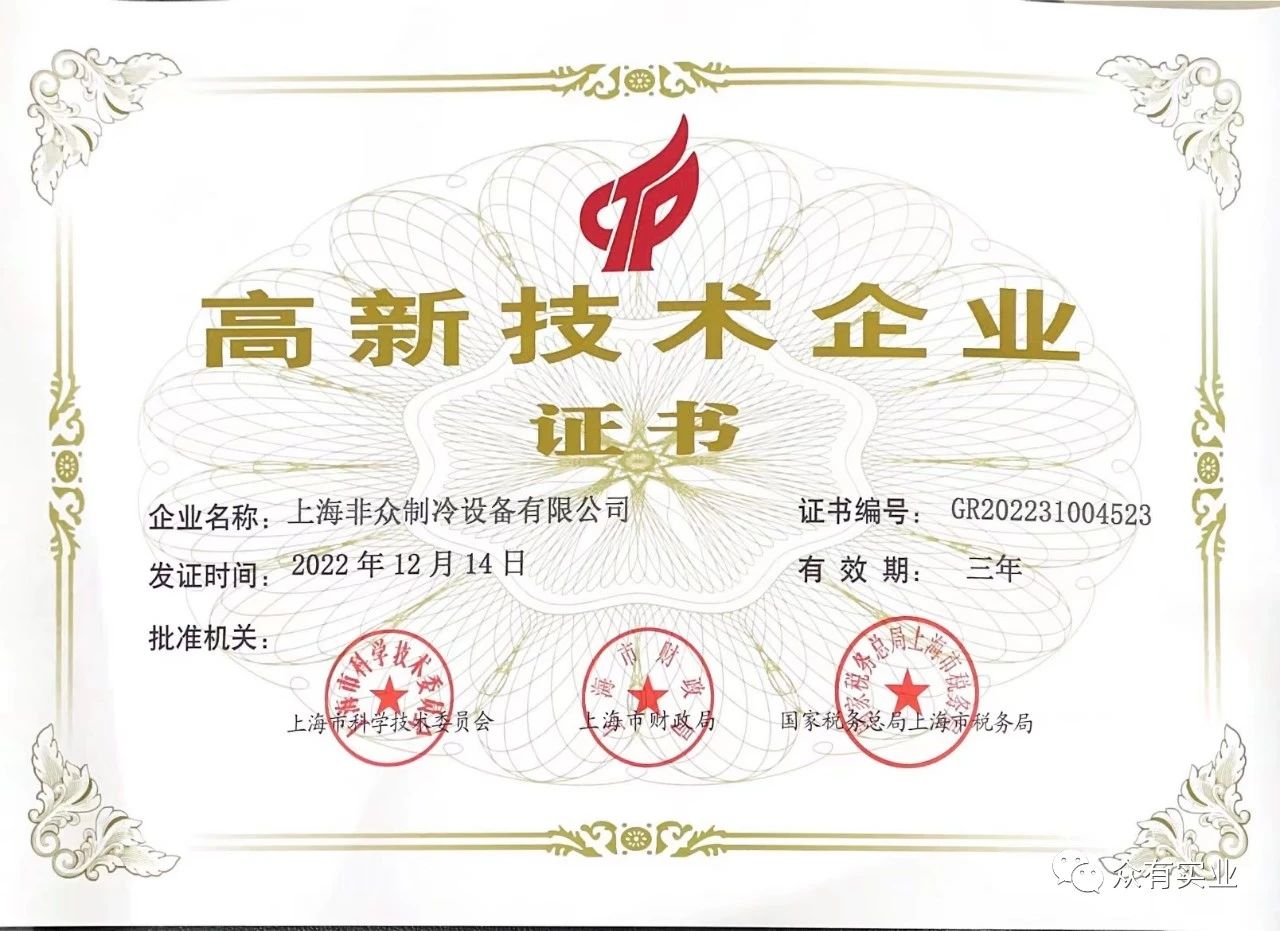 獲得高新技術(shù)企業(yè)認證,證明了非眾制冷在本領(lǐng)域中具有較強的技術(shù)創(chuàng)新能力、技術(shù)開發(fā)能力。