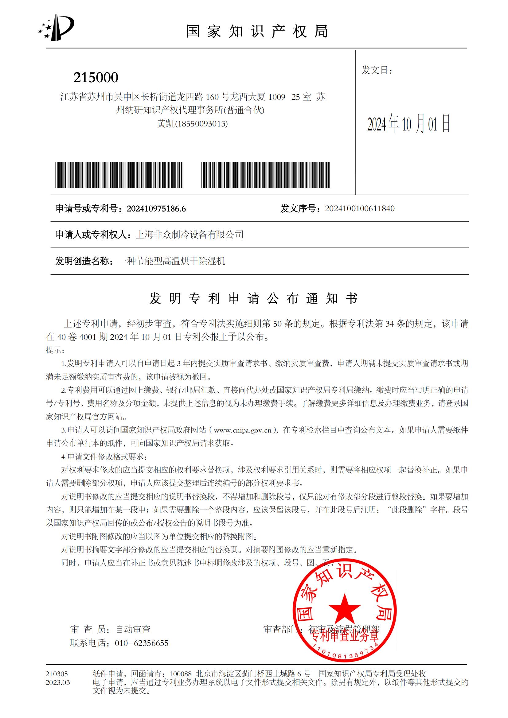 熱烈祝賀上海非眾制冷“一體式的屋頂空調(diào)機,專利號:ZL 2024 2 0258431.7”實用新型專利獲得國家知識產(chǎn)權(quán)局授權(quán),取得專利證書并申請公布發(fā)明專利“ 一種節(jié)能型高溫烘干除濕機,申請?zhí)柣驅(qū)@枺?/span>202410975186.6 ”